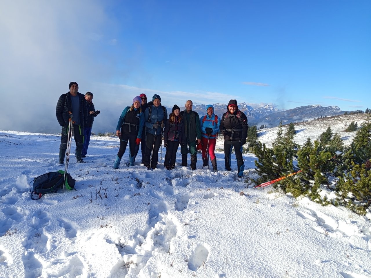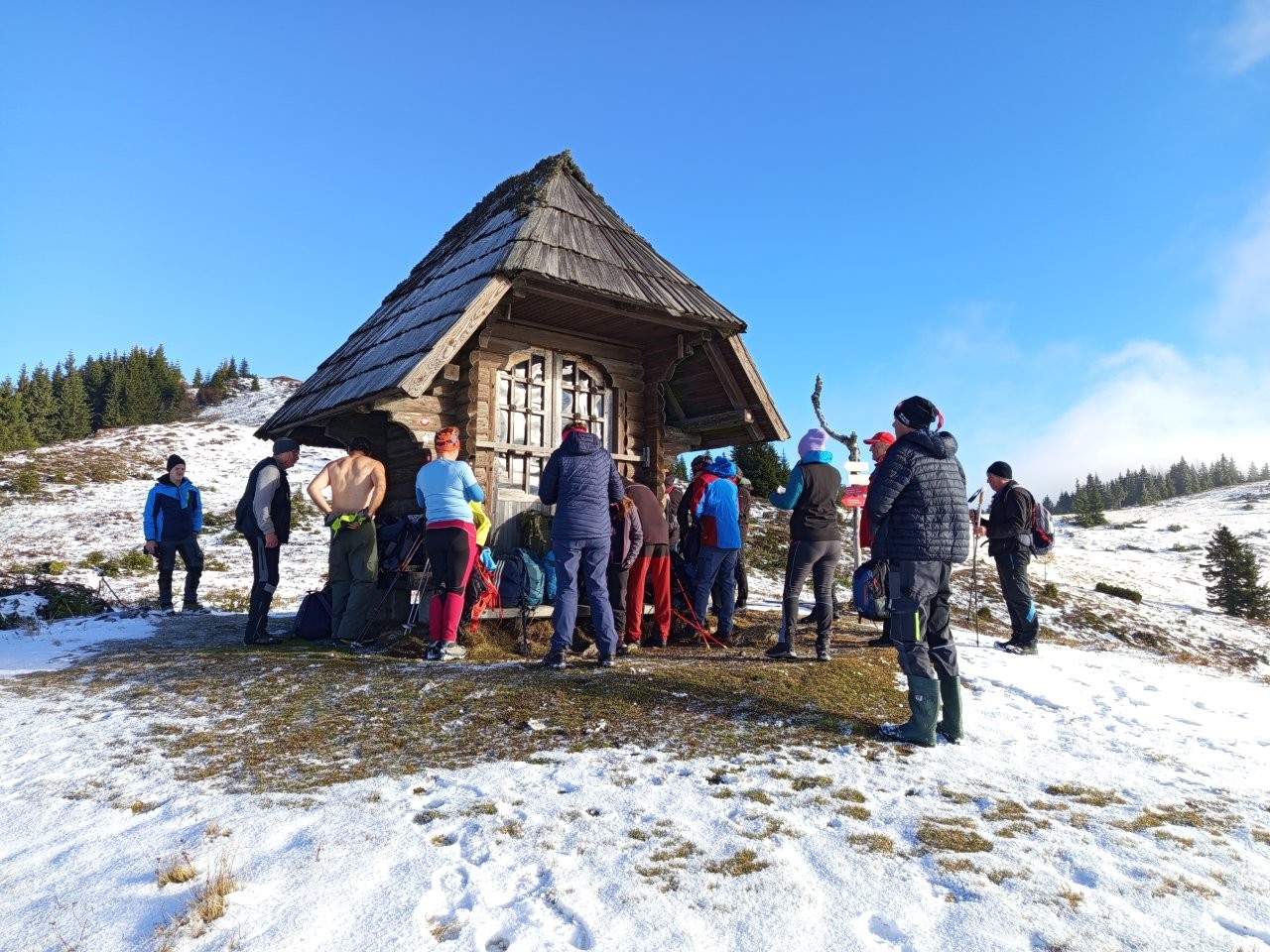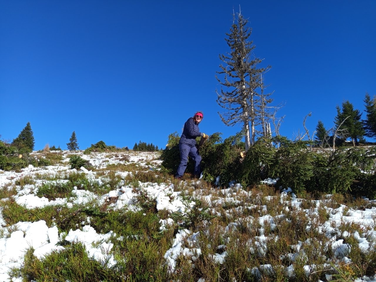 Ko smo prispeli skoraj do koče na Smrekovcu, smo nekaj metrov pod njo dvignili cestno zaporo na levi strani in zavili na tisti dan nekoliko zasneženo in poledenelo pot. Po 10 minutah vožnje od zapore smo avtomobile parkirali in se odpravili proti kapelici na Komnu, kamor smo morali prispeti do 9. ure, ko je bil zbor udeležencev akcije. Po hladnem jutru in dokaj strmem vzponu nas je na vrhu pričakalo sonce in z veseljem smo čez nekaj časa pozdravili preostale udeležence, predvsem pa Petra Tomšeta, podpredsednika NZ Smrekovec in člana PD Črna na Koroškem, ki je bil glavni koordinator akcije od samega začetka. Potrebno je bilo veliko usklajevanja med raznimi deležniki s področja varstva narave, gozdarstva itd., saj gre za poseg v zaščiten prostor, in Peter je vso zadevo pripeljal do možne izvedbe. Med udeležence čiščenja, okrog 20 se nas je zbralo, je razdelil ustrezne delovne rokavice, s preostalimi Korošci pa je do kapelice prinesel tudi sendviče in pijačo za vse udeležence akcije. Že dosti časa pred nami še v primernem vremenu so prostovoljci pašne skupnosti, PD Ljubno in Lovske družine Ljubno ob Savinji požagali drevesa in grmičevje smreke, danes pa smo se člani PD, vpetih v NZ Smrekovec, še z nekaterimi drugimi prostovoljci razkropili po pobočju Komna in nažagano smrečje spravljali na posamezne kupe. Postorili smo veliko, je pa zaradi zapadlega snega bilo delo oteženo in roke postopoma premočene, po opoldnevu pa je že marsikoga pošteno zazeblo zaradi vetra in z delom smo počasi končali, čeprav je na terenu še ostalo nepospravljeno nažagano smrečje. Malica je dobro dela, malo smo se podružili in se nato v skupinah podali na tri različne poti do izhodišč, tako kot smo prišli, s Petrom pa sva pobrala še smeti in jih vsak v eni vreči odnesla v dolino. Naša šaleška skupina se je ustavila še v koči na Smrekovcu, preden sem odpeljal Mitjo in Vero v dolino do parkirišča pred Ipponom ter Lučko v Velenje. Doma sem zaradi blatnega cestišča potreboval še nekaj časa, da sem očistil avto do mraka, med nas markaciste pa sem kmalu razdelil še 3 pare opranih in posušenih rokavic, ki so ostale pri kapelici po končanem delu.